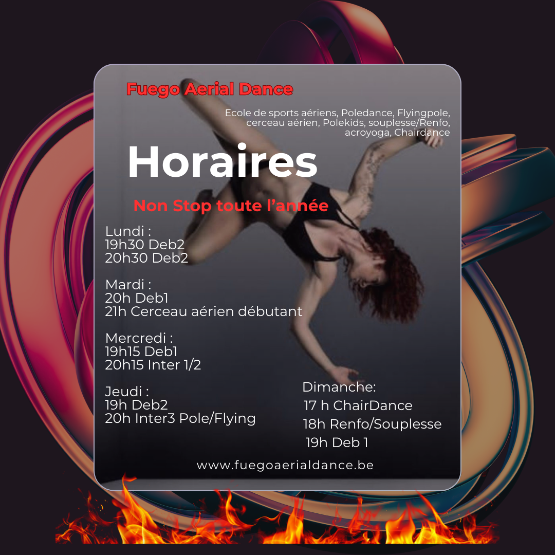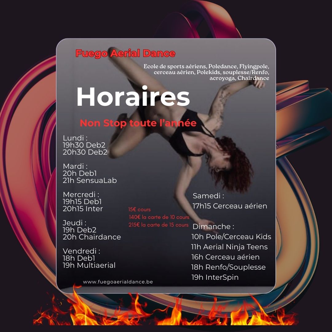 Fuego Aerial Dance propose des cours de Poledance, PoleHeels, Chairdance, Souplesse, Polekids, FlyingPole, Cerceau Aérien, Acro Yoga, hamock.
